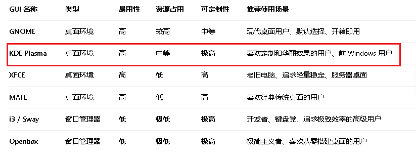 - 喜欢折腾和定制:KDE Plasma 提供了图形化的极致定制,而 i3/Openbox 则提供了通过配置文件的硬核定制。