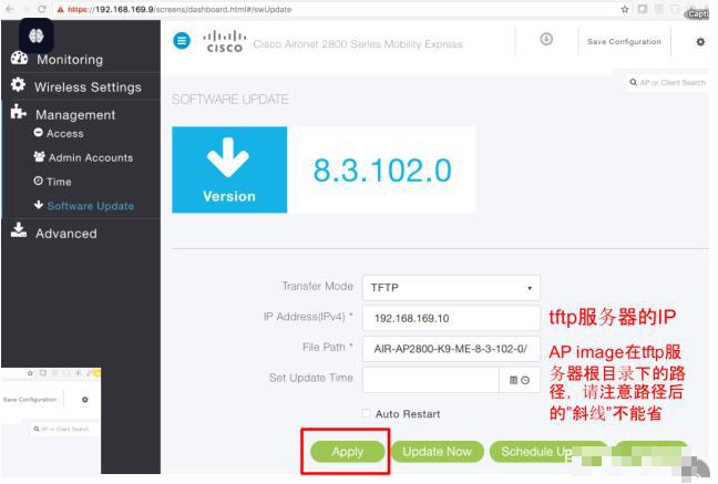 APE00E.DA99.799A#ap-type mobility-express tftp://192.168.169.10/AIR-AP2800-K9-ME-8-3-102-0.tar